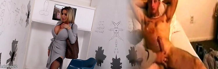 Busty blonde milf with humungous round baps enjoys her time in a gloryhole room