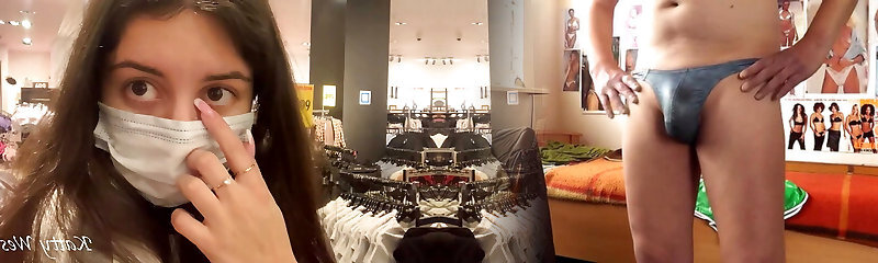 Fucking my slit with a huge fake penis in the public changing room of the mall