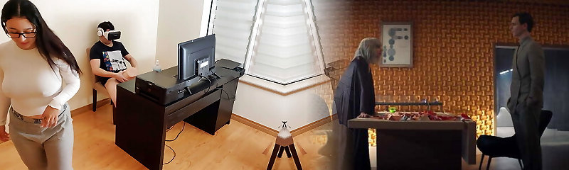 Super-fucking-hot stepmother masturbates next to her son-in-law while he watches porn with virtual reality glasses