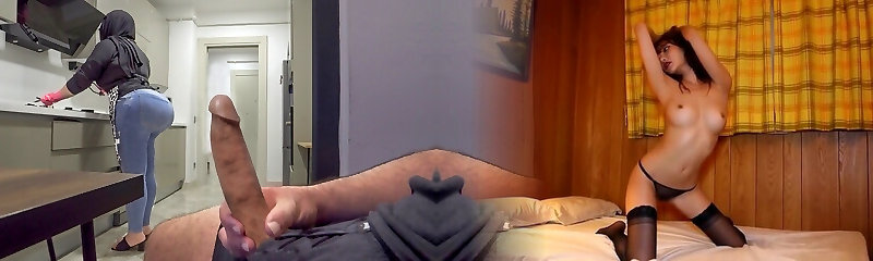 Risky jerk off while watching big booty hijab step-mother in the kitchen.