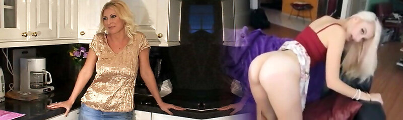 Blond mother with perfect jugs is seducing pool boy for sex on the kitchen
