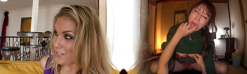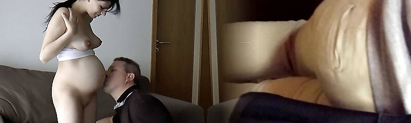 Black hair honey with nice tits on sofa fucking yam-sized cock watched by sexy blond