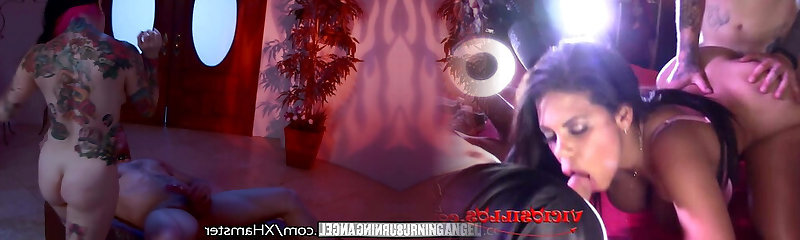 Tatted Goth Whore Throat Fucked By 2 Studs