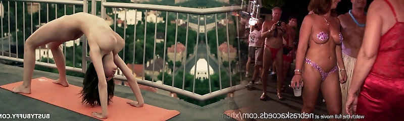 Gorgeous big tittied babe is doing yoga exercises outdoor