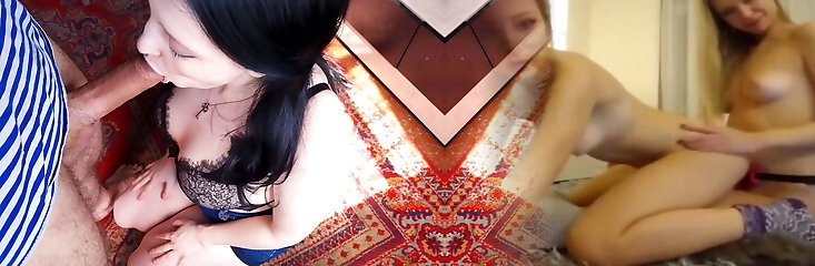 Black hair honey with nice tits on sofa fucking yam-sized cock watched by sexy blond