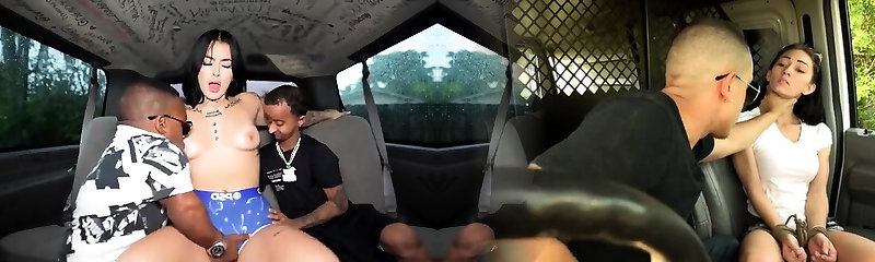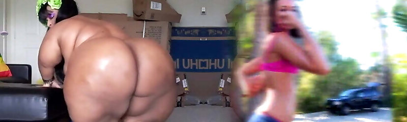 Super-fucking-hot, curvy ebony babe takes two hard milky cocks on the sofa
