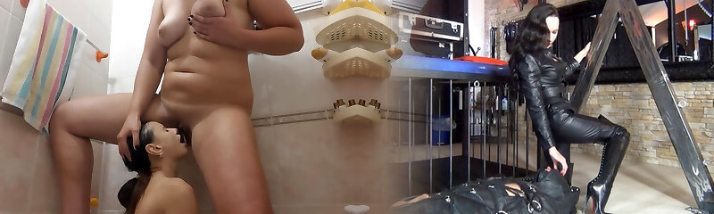Sexy MILF sits on her paramour's face. MILF pisses in her gimp's jaws and makes her drink her piss. Full scene