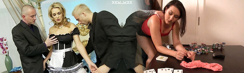Busty platinum-blonde maid gets her mouth and vulva fucked by two dudes