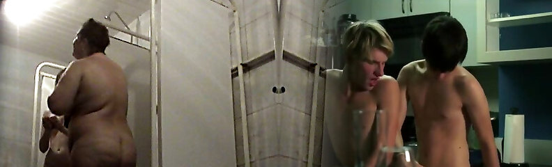 Lean and sexy young chicks plus one fat mature lady in the shower guest room