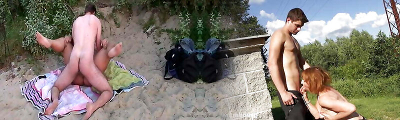 Some older fart is banging a hot mature slut with huge bra-stuffers on the beach